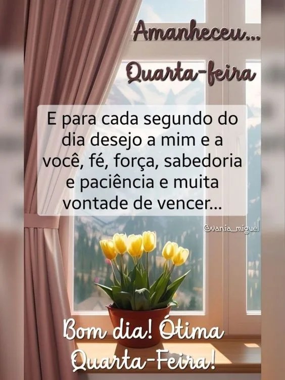 Bom dia, feliz quarta! Que Deus abençoe grandemente a sua manhã e aqueça o seu coração, trazendo luz e sabedoria para que consiga enfrentar todos os seus problemas.